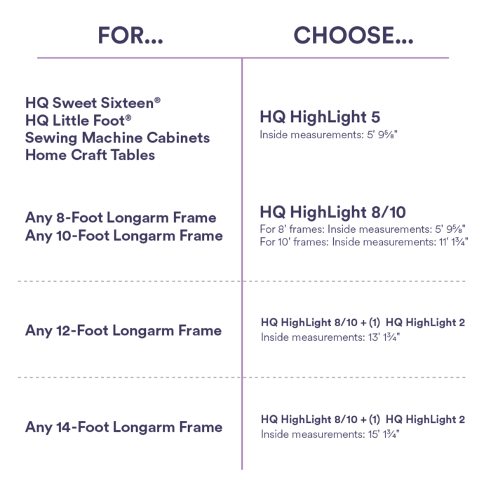 - For Little Foot frames and Stationary Machines (HQ Sweet Sixteen & HQ Capri) choose the HighLight 5.