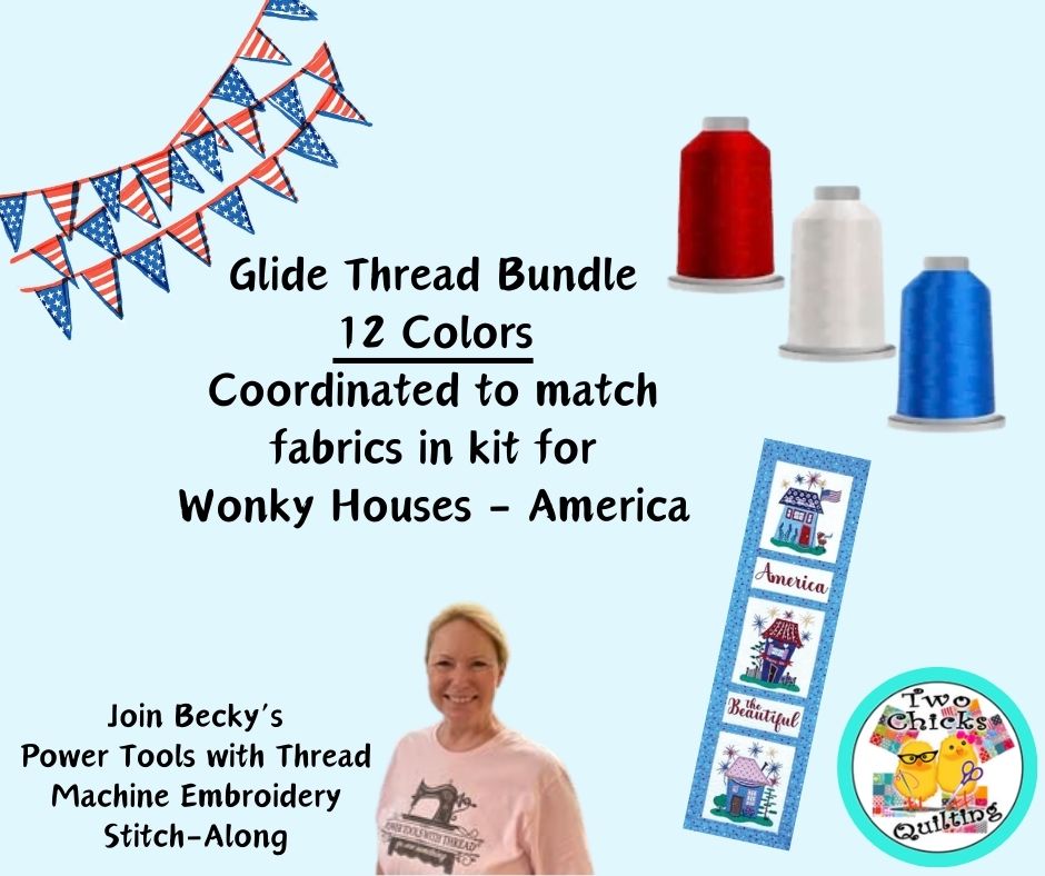 Becky with Power Tools With Thread will be hosting this Stitch-Along to start mid to late April. This Glide Thread Bundle contains: 12 coordinating thread colors for the Wonky Houses America 250 Project.