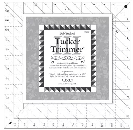 The third in the Tucker Trimmer series of rulers, this version of our Tucker Trimmer is used for any block or unit that is larger than a 6in finished block size.
