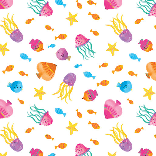 Start with the large pictorial panel (perfect for a quick kid’s quilt) next, check out the book panel - what a fun way for children to learn to sew and read. You’ll also find sweet starfish and seashells, bouncing bubbles, and a whole host of underwater friends for your favorite youngster.