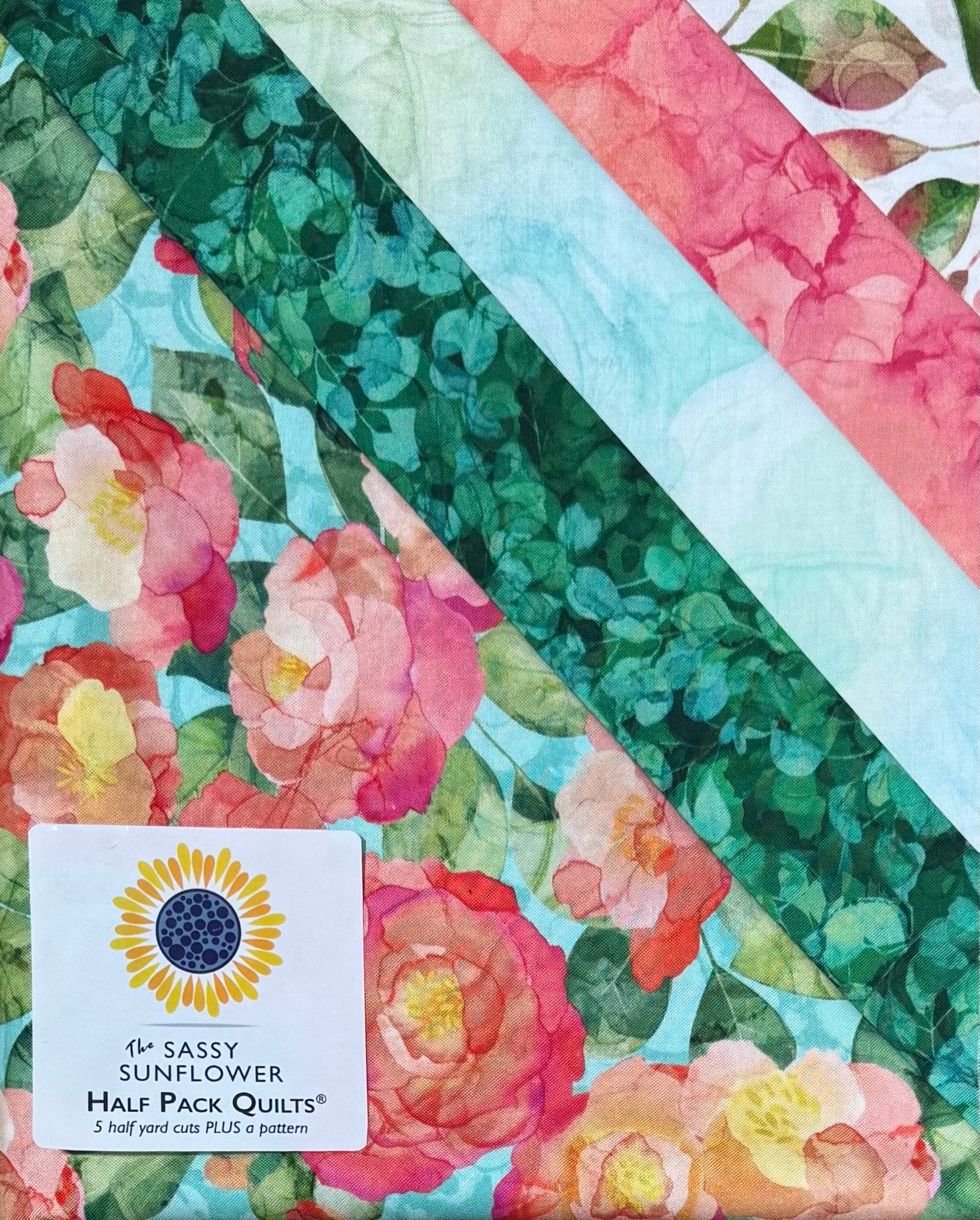 A Half Pack is 5 half yard cuts of fabric curated by Two Chicks Quilting PLUS your choice of a Sassy Sunflower pattern. Any of these Half Pack Fabric Kits will allow you to make your choice of nine quilt patterns or a tote bag.