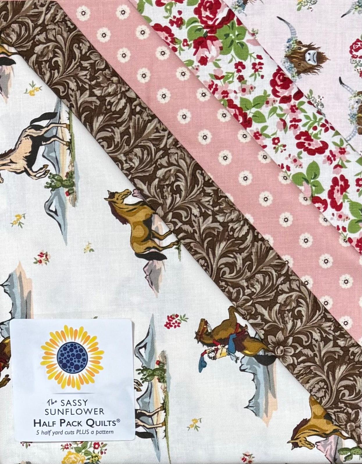 A Half Pack is 5 half yard cuts of fabric curated by Two Chicks Quilting PLUS your choice of a Sassy Sunflower pattern. Any of these Half Pack Fabric Kits will allow you to make your choice of nine quilt patterns or a tote bag.