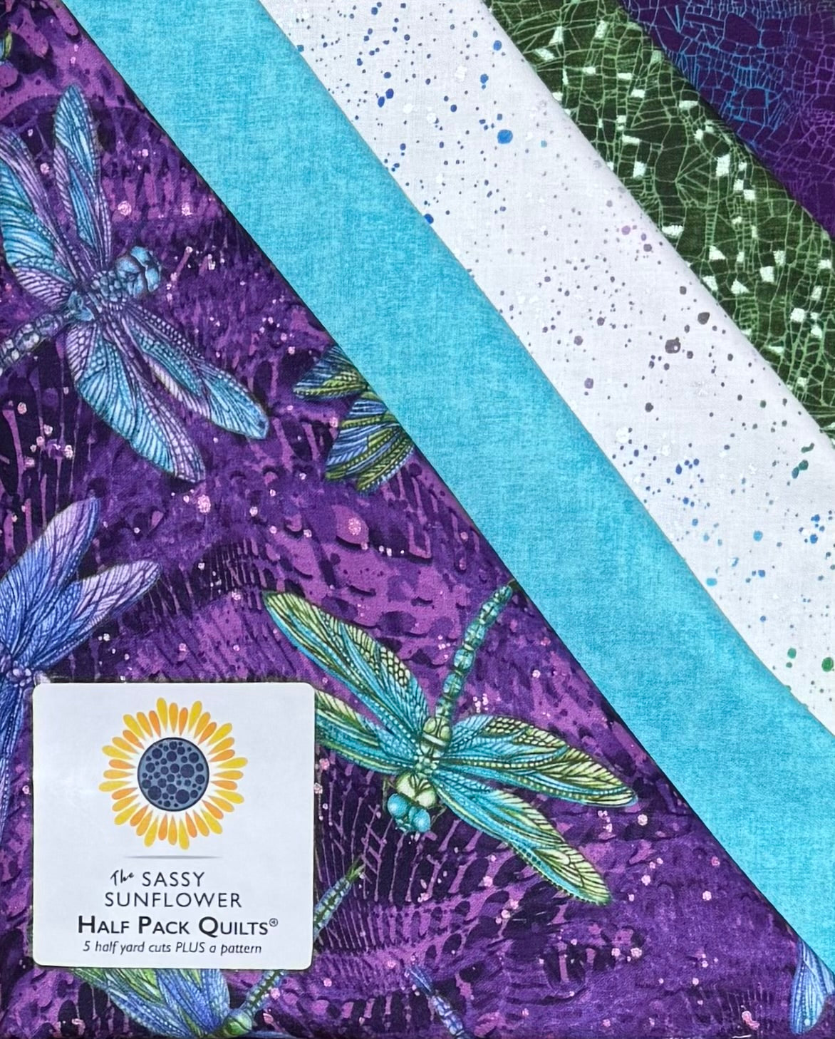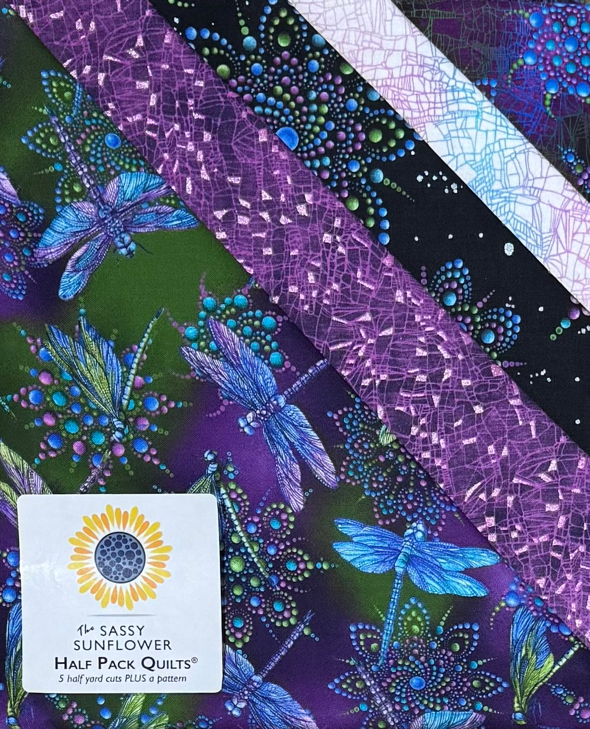 A Half Pack is 5 half yard cuts of fabric curated by Two Chicks Quilting PLUS your choice of a Sassy Sunflower pattern. Any of these Half Pack Fabric Kits will allow you to make your choice of nine quilt patterns or a tote bag.