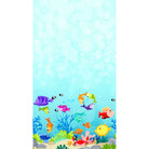The design features an array of playful sea creatures swimming amidst colorful coral reefs, swirling seaweed, and sparkling schools of fish. The color palette is a beautiful blend of oceanic blues, aquas, and an array colorful sea ceatures.