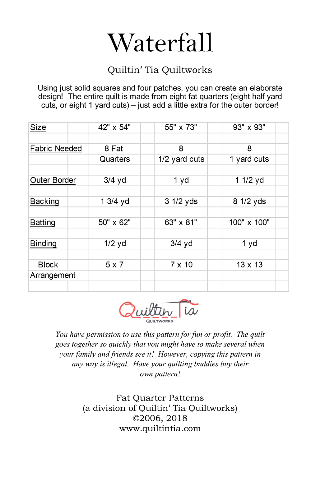 Quick and Easy - Uses just 8 fat quarters, 8 - 1/2 yd cuts, or 8 - 1 yd cuts! Three sizes included (crib, lap, and queen). Just add fabric for outer border.